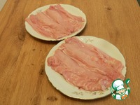 Филе обернем пищевой пленкой и отобьем его с 2-х сторон. |