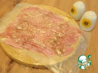 На верхнюю сторону филе разложим измельченный чеснок. Прикроем пленкой и отставим в сторонку. |