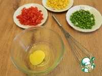 Взобьем яйцо слегка венчиком, добавим в него половину начинки из горошка, кукурузы и перца, присолим слегка и перемешаем массу. |