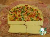 На филе разложим яичный блин, оставив край свободным на 3 см, несколько пластин сыра. |