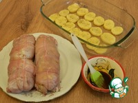 Уложила на картофель рулеты. И поставила форму в заранее разогретую до 190 градусов духовку на 40 минут. |