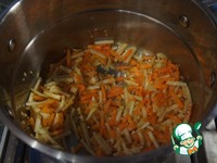 В кастрюле с толстым дном слегка спассеровать лук, морковь и корневой сельдерей. |