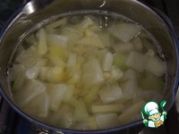 В кастрюлю влить бульон. Сколько, решайте сами, зависит от того, насколько густой суп вы любите. В крайнем случае всегда можно долить бульона, а вот убавлять проблематично. Всыпать кольраби. |
