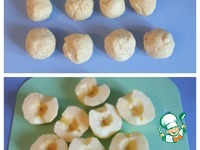 Разделить тесто по 50 гр. на 8 кусочков, еще небольшой кусочек теста останется для листиков. У яблок удалить сердцевину, очистить кожуру и разрезать на две половинки. |
