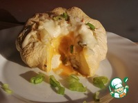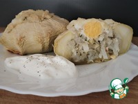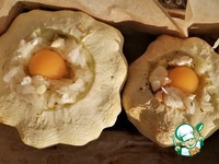 Затем снять фольгу, убрать крышечку, сделать углубление в начинке и аккуратно вылить яйцо (не повредив желтка). |