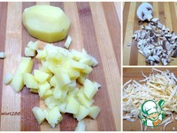 Картофель отварить до полуготовности – минут десять, с момента закипания. Картофель и шампиньоны нарезать мелко, сыр нашинковать. |