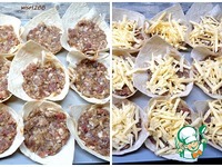 Колобки мясного фарша превратить в лепешки и уложить на шампиньоны. Завершить наполнение кулечков сыром. |