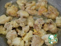 Сюда же добавьте курицу. Завяжите пакет и хорошо перемешайте, чтобы каждый кусочек покрылся крахмалом. |