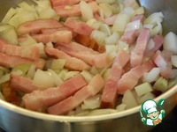 В сотейник добавим ложку растительного масла и обжарим в течение 2-х минут грудинку. |