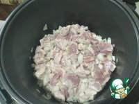 Отправляем в чашу растительное масло, лук и свинину - Режим "Жарка" 15 минут. (Желательно каждые 2-4 минуты перемешивать) |