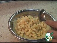 Потом добавляем твердый сыр нарезанный мелким кубиком и ещё раз хорошо перемешаем. |