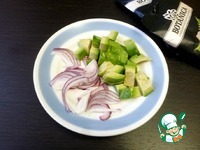 Авокадо почистить и нарезать кубиком. Сбрызнуть соком лимона. Лук нарезать перьями и посыпать щепоткой сахара. |