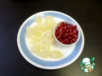 Помело разобрать на дольки, снять плёнку и нарезать кусочками. Гранат разобрать на зерна. |