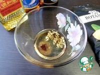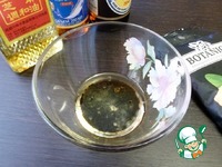 Приготовить заправку для салата. Смешать в пиалке кунжутное масло, рыбный и соевый соусы. |