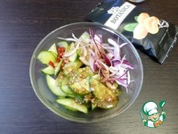 Тонко нарезать огурец полукольцами. Лук нарезать перьями. Измельчить перец чили. Если лук острый, то его лучше промыть холодной водой, иначе он весь вкус забьёт. |