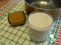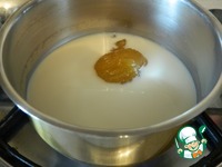 В кастрюлю нальем овсяное молоко, поставим ее на огонь, добавим мед, непрерывно помешивая, дождемся когда мед растворится. |