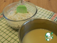 Молочномедовую смесь вольем к мучной смеси и хорошо перемешаем. |