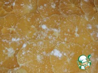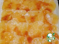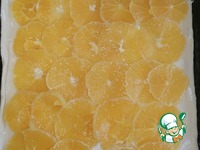 Противень смазать растительным маслом "Олейна". Положить раскатанное тесто, сверху посыпать крахмалом (1 ч. л. с горкой), затем чуть внахлест разложить апельсины. |