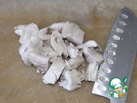 Куриный Окорочок заранее отвариваем в подсоленной воде, мякоть обрезаем и режем небольшими кусочками. |