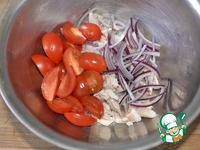 Помидорки черри режем пополам, если крупные, то на 4 части, добавляем к курице и Луку. |