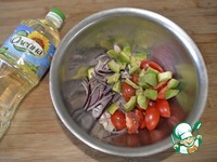 Авокадо режем пополам, проворачиваем, удаляем косточку, режем на кубики, сбрызгиваем соком Лимона. Кладём в салат. |