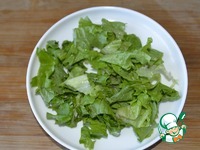 Листья салата моем, обсушиваем, рвём или режем, кладём на сервировочное блюдо. |