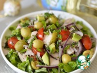 На Листья салата кладём салат. Посыпаем порезанным зелёным Луком и укропом, можете брать любую зелень по вкусу. Сверху кладём Оливки, порезанные пополам. Приятного аппетита! |
