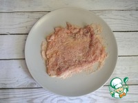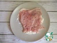 Греем сковороду с маслом. Шницель солим немного и перчим с обеих сторон. Обваливаем в муке первый шницель. |