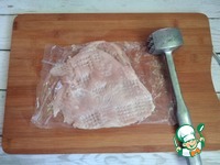 На два шницеля взяла куриную грудку. Сняла кожу, убрала плёнки и разрезала пополам на два филе, весом примерно 250 г каждое. Надрезала, не прорезая, каждое филе вдоль. |