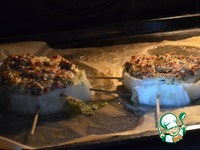 Духовку включить на разогрев. Нарезать капусту на порции, для того чтоб не развалилась, проткните капусту двумя шпажками. Поместить на лист пергамента или на фольгу. Посолить. |