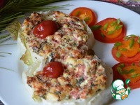 В противень влить 1/2 стакана кипятка. Запекать на нижнем уровне при 180-200 градусах 20-25 минут, до мягкости капусты. |