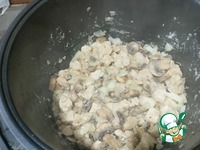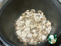 Отправляем в чашу масло, грибы и куриное филе — Режим «Жарка» 10 минут. (Не забываем перемешивать каждые 3-4 минуты) |