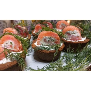 Описание: Предлагаю попробовать классическое сочетание красной рыбы и тёмного хлеба в новом исполнении - приготовить тарталетки из тёмного хлеба (он лучше всего сочетается с красной рыбой ), с рулетиками из слабосоленой сёмги (можно взять любую красную рыбу) и творожного сыра с добавлением укропа ( добавки любой зелени по вкусу, либо можно взять уже готовый творожный сыр с разными добавками). Тем более, что готовится эта закуска очень быстро и легко! Тарталетки можно приготовить заранее и хранить в пищевом пакете в холодильнике до 3-х дней.