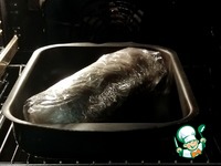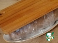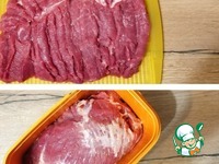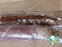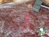 Выложила мясо в пищевой пакет, слегка отбила в местах утолщения, пласт стал тоньше ~ 2,5 см. Придала форму прямоугольника. |
