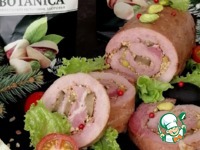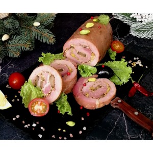 Описание: Аппетитный, ароматный, пряный мясной рулет. Пикантности вкусу добавят фисташки и маслины. Рулет можно приготовить из цельного куска окорока, лопатки или брюшины. Если планируете подавать, как холодную закуску, можно приготовить заранее до праздничного застолья. Рулет можно подавать и как горячее блюдо, тогда замариновать заранее, а запечь перед подачей.