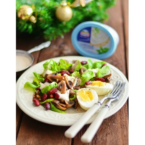 Для заправки смешайте творожный сыр Хохланд с лимонным соком, горчицей, соевым соусом, чесночным порошком и прованскими травами |