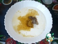 Йогурт смешать с лимонным соком, солью, смесью перцев, итальянскими травами, карри и растительным маслом. |