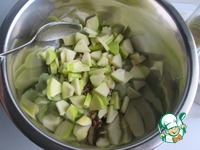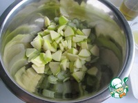 Яблоки процедить от лимонного сока и добавить в салат. Лимонный сок пригодится для приготовления заправки. |