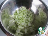 Черешковый сельдерей хорошо вымыть, тонко нарезать и поместить в посуду для приготовления. |