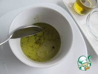 Приготовить заправку на основе оставшегося лимонного сока с добавлением 2 ст. л. оливкового масла, соли и чёрного молотого перца ( по вкусу). |