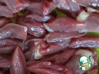 Отчистить сердечки от сгустков крови, срезать сосудики (жилки), промыть проточной водой, разрезать вдоль на 4 части (полосочками) |