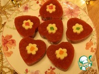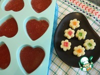 Можно разрезать на квадратики, обсыпать кокосовой стружкой и пить чай с конфетками. Но мне захотелось сделать десерт с ягодным желе, где украшением служат эти конфетки. |