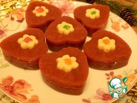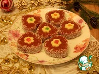 Кисточкой смажем бока желе, у меня оно в виде сердечек и окунем в кокосовую стружку. Получился замечательный декор - Новогодний. Подаем к столу. |