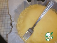 Форму для запекания (26 см) застелить пергаментной бумагой. Аккуратно перенести первый раскатанный круг. Отступив от краёв по 1 см выкладываем творожную начинку. |
