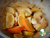 Айву вымыть, нарезать крупно. Оставшийся апельсин нарезать. Фрукты перемешать в оставшемся маринаде, добавив 1 ст. л. растительного масла. |