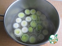 Лук-порей нарезать и отварить в подсоленной воде 5 минут. Потом откинуть на сито, дать стечь воде и охладить (можно быстро под проточной водой). |