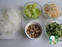 Дайкон очистить и натереть на крупной тёрке. Орехи измельчить (я прокатала скалкой). Огурец мелко нарезать. Сыр натереть на крупной тёрке. Лук - порей. |