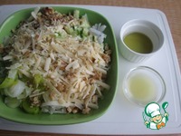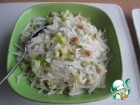 Описание: Предлагаю приготовить салат с дайконом, луком-пореем, сыром и орехами. Дайкон, натёртый на тёрке, и добавленное оливковое масло, дают достаточно сочности салату, а лимонный сок добавляет цитрусовые нотки. Рецепт взят из интернета.