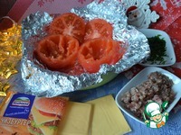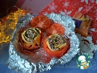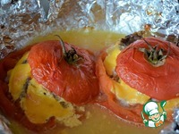 Запекать при 200 градусах 15-20 минут. P.S.: Если бы стенки помидорных чашек были толще, они бы не развалились. Но, слава Богу, на вкус это не повлияло. |