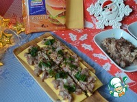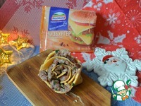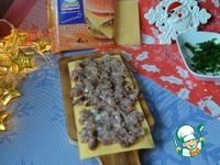 Две пластинки плавленого сыра разложить на доске, на них нанести фарш. Я использую плавленый сыр Чизбургер от ТМ Hochland. |
